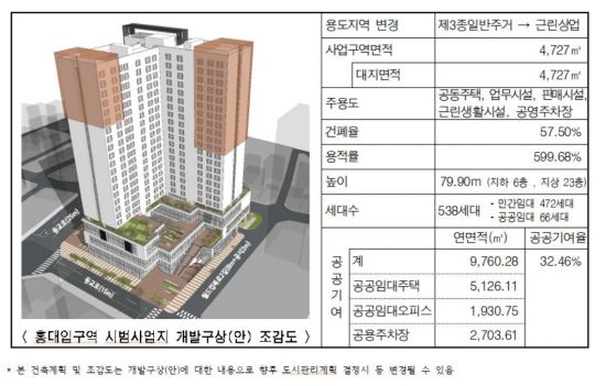 홍대입구역 주변(부지면적 4727㎡)은 서울에서 청년 1~2인가구가 가장 밀집한 곳 중 하나인 특성을 고려해 청년들의 삶터와 일터, 쉼터가 어우러진 공간으로 조성된다. 소형세대와 셰어하우스 중심의 양질의 주택을 총 538가구 규모로 공급하고 청년들이 24시간 머무르며 활동할 수 있는 창업·문화·활동 공간도 확충된다. 홍대입구역 일대는 보행·유동인구가 많은 지역임을 감안해 전면·공개공지를 활용해 보행공간을 확보하고 공영주차장을 설치해 가로변 불법주차 문제 해소에도 나선다는 계획이다.