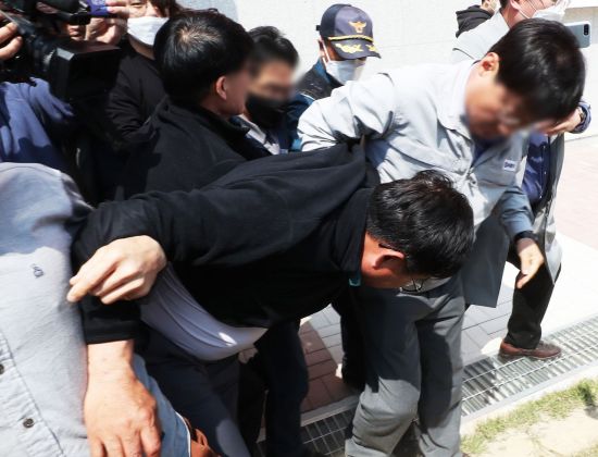 대규모 인명피해가 발생한 경기도 이천시의 한 물류창고 공사장 화재 현장 인근 모가체육공원에 마련된 피해 가족 휴게실에서 30일 오후 시공사 대표가 피해자 가족 항의를 받으며 떠나고 있다. [이미지출처=연합뉴스]