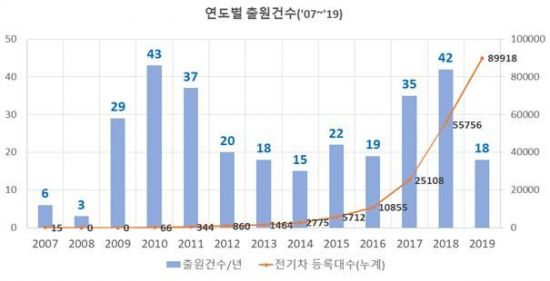 이는 2009년 국산 전기차가 처음 개발된 것을 시작으로 전기차 관련 전력서비스에 대한 출원이 활성화되고 여기에 친환경 산업정책이 더해지면서 전기차 보급이 확대된 데 따른 결과물로 해석된다.