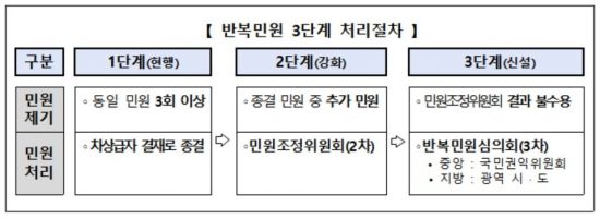차상급자 결재(1단계) 후에도 다시 제기되는 민원은 각 기관별로 외부전문가가 참여하는 민원조정위원회의 경청·조정 절차(2단계)를 거치도록 하고, 이를 불수용하는 민원에 대해서는 제3의 기관인 반복민원심의회에서 한번 더 심의(3단계)해 국민의 목소리를 최대한 경청하도록 했다.