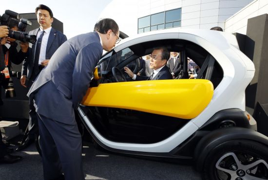 문재인 대통령이 지난해 10월 경기도 화성시 현대자동차 남양연구소에서 열린 미래차산업 국가비전 선포식이 끝난 뒤 미래차산업 전시장을 방문해 전기차 '트위지'에 탑승해 질문하는 모습.(사진=연합뉴스)