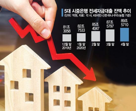 올 들어 신한은행을 비롯해 시중은행들의 전세자금대출은 가파르게 불어났다. 신한ㆍKB국민ㆍ하나ㆍ우리ㆍNH농협 등 5대 시중은행의 올 1월 말 전세자금대출 잔액 합계는 82조7533억원으로 전월 말에 비해 1조4475억원 늘었다. 이후 전세자금대출은 2월 한 달 동안 2조6000억원 넘게 급증하더니 3월과 4월에도 2조원 가량의 증가폭을 보였다. 특히 이 가운데 신한은행의 증가세가 두드러졌다. 1월 한 달 4000억원 정도였던 전세자금대출 증가폭은 이후 급격히 늘더니 4월에는 1월의 두 배인 8000억원을 넘어섰다. 신한은행의 전세대출 잔액 규모는 지난 2월 5대 은행 중 처음으로 20조원을 돌파한 것으로 파악됐다.