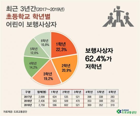 24일 도로교통공단에 따르면 2017~2019년 최근 3년간 발생한 초등학생 보행사고로 총 42명이 숨지고, 7852명이 다쳤다. 특히 처음 학교생활을 시작하는 1학년이 1763명(22.3%)으로 가장 많은 사상자가 발생했다. 3학년 이하 저학년은 전체 사상자의 62.4%를 차지했다.