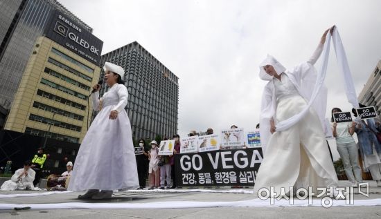 24일 서울 종로구 광화문광장에서 열린 비건(Vegan)을 지향하는 모든 사람들 '인간의 식용, 실험으로 희생된 동물들을 위로하고 사죄하는 진혼제'에서 국가무형문화재 제57호 경기민요이수자 최수정씨가 동물들의 영혼을 위로하고 있다./김현민 기자 kimhyun81@