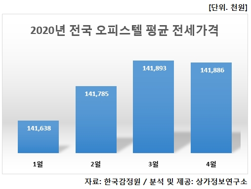26일 상가정보연구소에 따르면 지난달 전국 오피스텔 평균 전세가격은 1억4188만6000원을 기록했다. 전월 1억4189만3000원 대비 7000원 하락한 금액이다. 하락폭이 크지는 않지만 오피스텔 전세가격이 떨어진 것은 2019년 7월 이후 9개월 만이다.