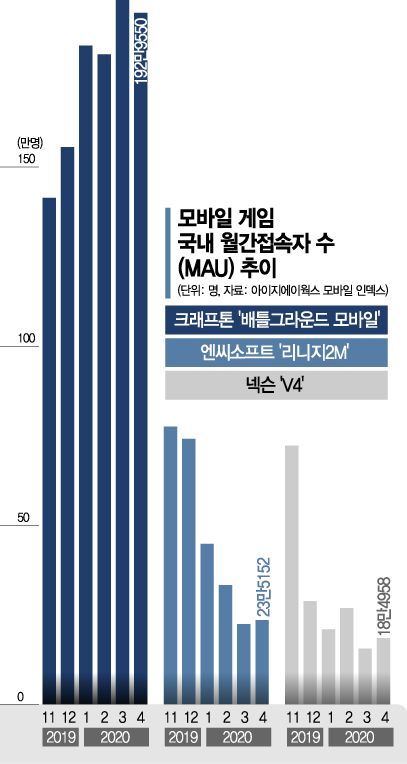 반면 MMORPG 장르 게임들은 코로나19 사태 이후 접속자가 조금씩 줄었다. 지난해 11월 선보인 엔씨소프트 '리니지2M'의 월간 접속자 수는 출시 첫 달인 지난해 11월 77만5524명을 기록했다가 지난달에는 23만5152명으로 떨어졌다. 같은 달 출시된 넥슨 'V4' 역시 출시 첫 달 72만2182명에서 지난달 18만4958명으로 감소했다. 게임 업계 관계자는 "국내 모바일 접속자를 기준으로 보면 배틀로열 장르가 코로나19의 혜택을 가장 많이 받은 것으로 보인다"고 설명했다.