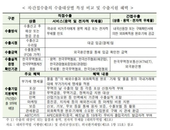 무역협회가 서비스 수출기업 10개를 대상으로 실시한 인터뷰 조사에서도 절반이 ‘직·간접 수출의 개념이나 수출 지원혜택 대상 여부에 대해 잘 모른다’고 응답했다. 혜택을 알더라도 ‘대출 등 실제 혜택이 부족’하거나 ‘혜택 적용 여부가 모호해 수출실적 증명서를 발급하지 않는다’는 기업이 다수였다.
