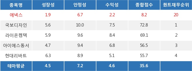 씽크풀 로보알고리즘 RASSI의 분석에 따르면, 에넥스의 퀀트 재무 점수는 8.23점으로 리모델링/인테리어 관련 다른 종목 평균 보다 안정성과 수익성, 성장성 점수가 모두 낮은 편이다. 이는 재무적 측면에서 에넥스가 다른 종목 대비 투자 매력도가 그다지 높지 않다는 것으로 해석될 수 있다. 반면에 국보디자인은 다른 종목 평균 대비 높은 성장성과 안정성, 수익성 점수로 퀀트 재무 순위 1위를 차지했다.