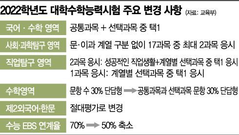 제2외국어와 한문 영역은 인문계열에서 탐구 영역 1과목으로 대체될 수 있었지만 2022학년도부터 절대평가로 바뀌면서 변별력 문제 때문에 정시에 반영하는 대학은 거의 없다. 오종운 종로학원하늘교육 평가이사는 "수학의 경우 현재 시험과 비교해볼 때 문항 구성까지 달라져 시간 배분이 중요하다. 그런 만큼 모의고사를 통한 철저한 준비가 필요하다"고 조언했다.