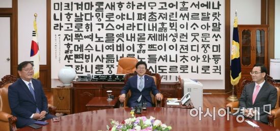 박병석 국회의장이 5일 국회 의장실에서 김태년 더불어민주당 원내대표와 주호영 미래통합당 원내대표와 회동을 갖고 있다. 이 자리는 박 의장이 21대 전반기 국회 원구성을 협상하기 위해 마련했다./윤동주 기자 doso7@