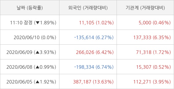 오늘 외국인은 두산중공업을 1만 1105주 순매수 하고 기관은 5000주 순매수 하는 것으로 잠정 집계되고 있다. 최근 5일 동안 개인 투자자들은 101만 5356주 순매도 했고, 외국인과 기관은 각각 40만 888주 순매수, 60만 8900주 순매수 했다.
