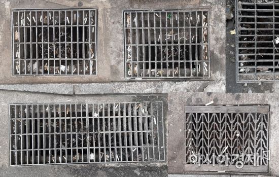 17일 오후 서울 한 번화가 일대 하수구. 담배꽁초와 각종 오물로 가득차있다. 한 연구 조사 결과에 따르면 쓰레기로 꽉 찬 하수구는 제 역할을 할 수 없어 침수피해를 3배 이상 키울 수 있다.사진=한승곤 기자 hsg@asiae.co.kr