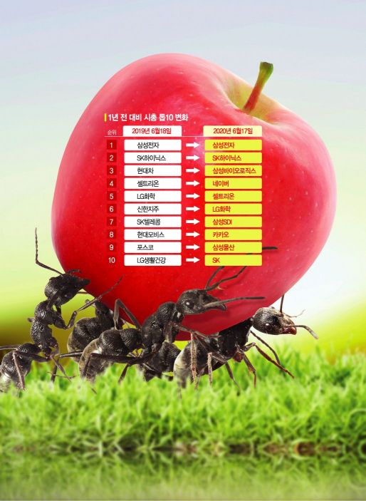 19일 한국거래소에 따르면 연초인 올해 1월2일 국내 증시 시가총액 순위를 살펴보면 삼성전자, SK하이닉스, 네이버(NAVER), 삼성바이오로직스, 현대차, 현대모비스, 셀트리온, LG화학, 포스코(POSCO), 삼성물산 등의 순이었다. 수출 중심의 전통적 제조업 종목들이 대거 시가총액 상위주에 포진했다.