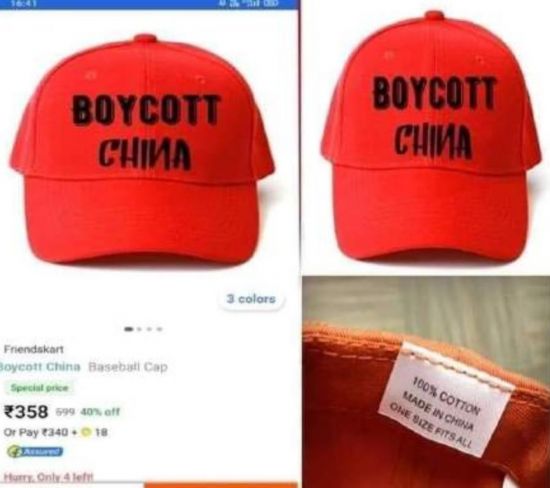 23일 중국 소셜네트워크서비스(SNS) 웨이보에는 며칠 전부터 인도인들에게 인기몰이를 하고 있는 '보이콧 차이나' 등 반중 구호가 적힌 모자, 티셔츠, 현수막 등이 올라오고 있다. 인도에서 불티나게 판매중인 반중 구호가 적힌 상품들 대부분이 중국에서 만들어졌다는 내용이 담긴 언론보도도 확산되고 있다. 인도에서 반중 정서가 넓게 퍼지면서 반중 구호가 적힌 제품들이 잘 팔리고 있는데, 이런 제품들이 정작 중국에서 만들어져 인도로 수출되고 있다는 내용들이다.