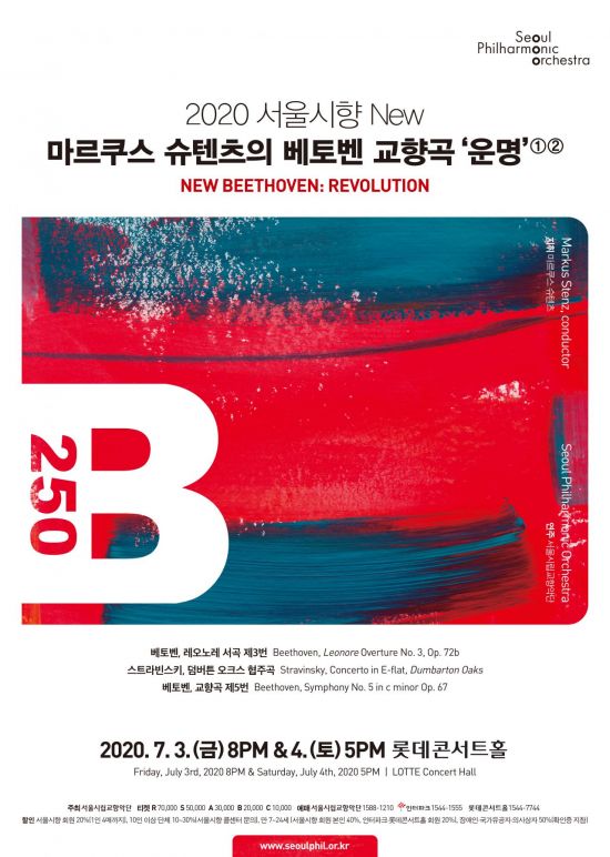 이날 공연은 서울시향 수석객원지휘자 마르쿠스 슈텐츠의 지휘로 진행된다. '운명' 연주에 앞서 1부 공연에서는 베토벤의 '레오노레 서곡 3번'과 스트라빈스키의 '덤버튼 오크스 협주곡'을 연주한다.