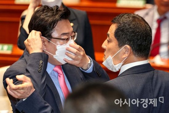 김성원(왼쪽) 미래통합당 원내수석부대표와 박대출 의원이 26일 서울 여의도 국회에서 열린 '미래통합당 긴급의원총회'에서 의견을 나누고 있다./강진형 기자aymsdream@