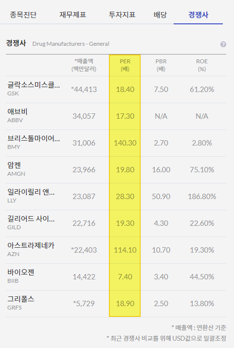 미국주식 분석 전문 서비스를 제공하는 초이스스탁US에 따르면 길리어드 사이언스의 매출액 규모와 비슷한 기업 중 주가수익배수(PER)가 가장 낮은 기업은 바이오젠(BIIB)으로 7.4배를 기록했다. 길리어드 사이언스 PER은 19.3배, 애브비(ABBV) 17.3배, 암젠(AMGN) 19.8배, 글락소스미스클라인(GSK) 18.4배로 나타났다.