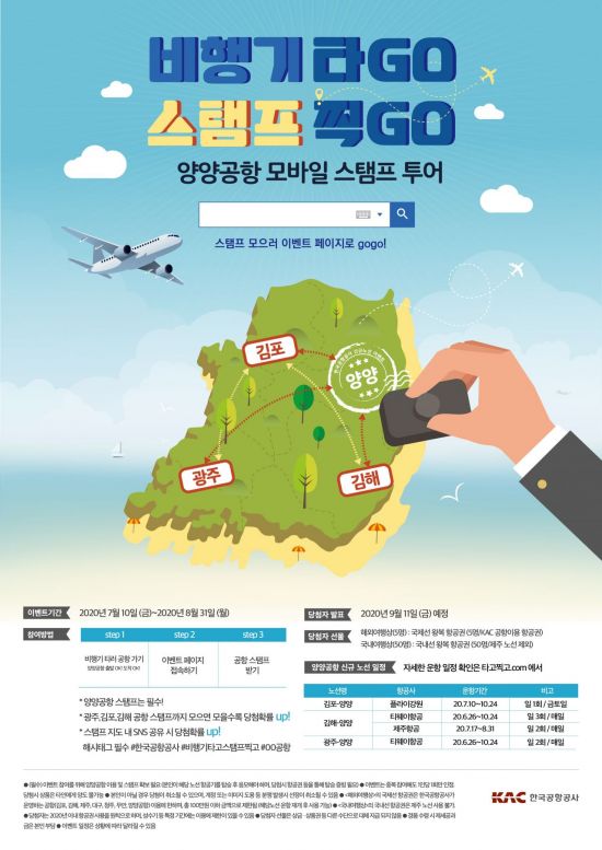 또 '타고! 찍고! 양양공항 모바일 스탬프 투어' 이벤트도 진행된다. 이는 김포, 김해, 광주공항에서 새로 개설된 양양공항 노선을 이용하고 공항에서 모바일 스탬프를 모으면 추첨을 통해 국제선 및 국내선 항공권을 제공한다. 김포, 김해, 광주발 양양노선을 개설 또는 준비하고 있는 항공사는 티웨이항공, 플라이강원, 제주항공 등이다.