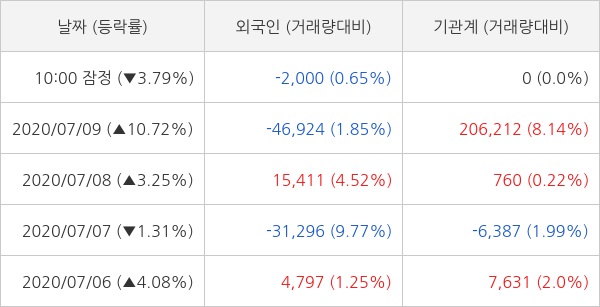 오늘 외국인은 2000주 순매도 하는 것으로 잠정 집계되고 있다. 최근 5일 동안 개인 투자자들은 20만 3085주 순매도 했고, 외국인과 기관은 각각 4140주 순매도, 20만 8962주 순매수 했다.
