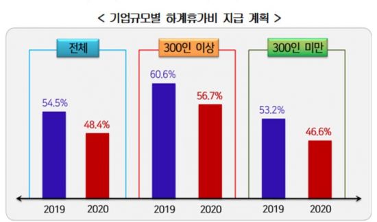 평균 여름휴가 기간은 소폭 늘어난 반면 여름휴가비를 지급하겠다는 기업의 비중은 지난해보다 줄었다. 올해 휴가비 지급 예정인 기업은 전체 응답 기업의 48.4%로 전년(54.5%)에 비해 6.1%포인트 감소했다. 특히 300인 미만 기업의 경우 46.6%만 올해 여름 휴가비를 지급 예정이라고 답변했다.