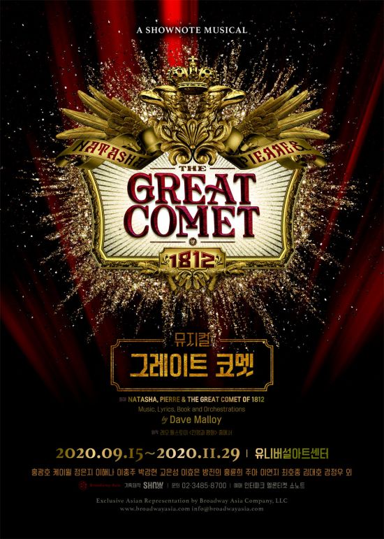 그레이트 코멧은 미국 공연계에서 가장 주목받는 작곡가 겸 극작가인 데이브 말로이가 연출가 레이첼 챠브킨과 손잡고 만든 성스루(sung-throgh) 뮤지컬이다. 2012년 오프 브로드웨이에서 호평 속에 첫선을 보였고, 2016년에 브로드웨이 임페리얼 씨어터에 입성했다. 브로드웨이 공연에서는 세계적인 팝페라 가수 조쉬 그로반이 주인공으로 참여했다. 2017년 토니 어워드에서 '최우수 뮤지컬상'을 포함해 최다인 12개 부문 수상 후보에 올랐고 드라마 데스크 어워드 4개 부문과 외부 비평가 협회 어워드에서 2개 부문을 수상하며 작품성을 인정받았다.