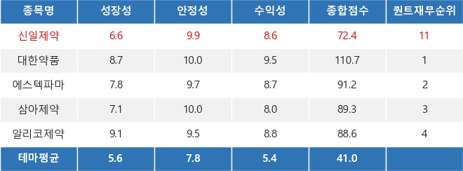 씽크풀 로보알고리즘 RASSI의 분석에 따르면, 신일제약은 성장성, 안정성, 수익성 모두 테마의 평균 점수를 상회하면서 퀀트 재무 순위 11위(총 75종목)를 차지했다. 이는 재무적인 측면에서 테마 내 다른 종목들에 비해 신일제약의 투자 매력도가 높은 편이라고 해석될 수 있다.
