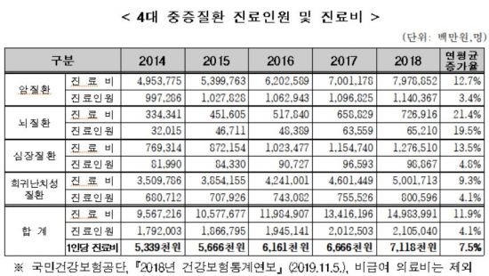 4대 중증질환 1인 진료비도 연평균 7.5%↑