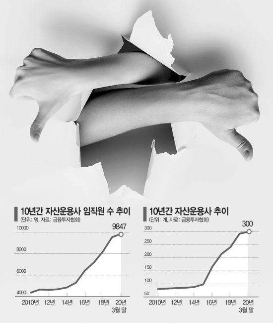 22일 금융투자협회에 따르면 최근 10년간 자산운용사 수와 임직원 수를 조사한 결과, 2010년 80개에 불과했던 자산운용사는 올 3월말 300개로 275% 증가했다. 같은 기간 임직원 수는 4373명에서 9847명으로 2배 이상 늘었다. 올 1분기에만 302명이 증가해 올해 말에는 자산운용사 임직원 수는 1만명을 넘어설 전망이다.