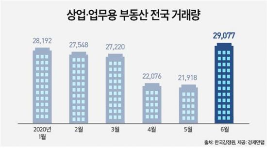 25일 한국감정원에 따르면 지난달 상업·업무용 부동산 거래량은 2만9077건으로 전월 대비 32.66% 전년동기 대비 24.26% 상승했다. 올해 초 신종 코로나바이러스감염증(코로나19) 여파에 따른 경기 악화로 상업용 부동산 거래가 급격히 하락했다가 반등한 모습이다. 지난 1월 2만8192건을 기록한 상업·업무용 부동산 거래량은 5월 들어서는 2만1918건까지 감소, 1월 대비 22.3% 하락한 바 있다.