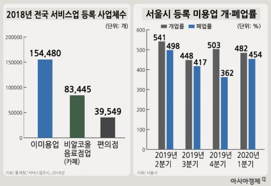전국 미용실 수는 약 15만 개로 카페(8만개), 편의점(4만개) 보다 많다. 폐업률도 개업률과 비등한 수준으로 나타나 치열한 경쟁과 열악한 시장구조를 보여주고 있다. 그래픽 = 이진경 디자이너