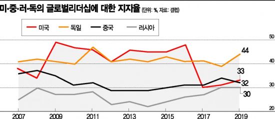 27일(현지시간) 여론조사기관 갤럽이 지난해 3월부터 올해 2월까지 전 세계 135개국 국민 1000명씩을 대상으로 실시한 미국, 중국, 독일, 러시아의 글로벌 리더십에 대한 인식조사에 따르면 미국의 글로벌 리더십을 지지한다는 응답은 33%에 불과했다.