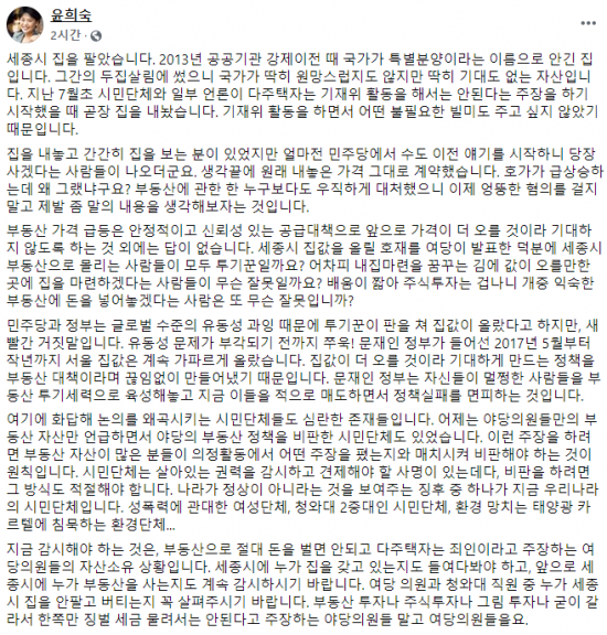 그는 "여당 의원과 청와대 직원 중 누가 세종시 집을 안 팔고 버티는지 꼭 살펴주시기 바란다"며 "부동산 투자나 주식투자나 그림 투자나 굳이 갈라서 한쪽만 징벌적 세금 물려서는 안된다고 주장하는 야당 의원들 말고 여당 의원들을"이라고 말했다.