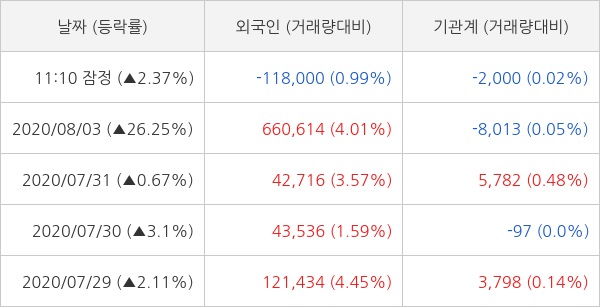 오늘 외국인은 넥슨지티를 11만 8000주 순매도 하고 기관은 2000주 순매도 하는 것으로 잠정 집계되고 있다. 최근 5일 동안 개인 투자자들은 86만 4777주 순매도 했고, 외국인과 기관은 각각 87만 9796주 순매수, 2898주 순매수 했다.