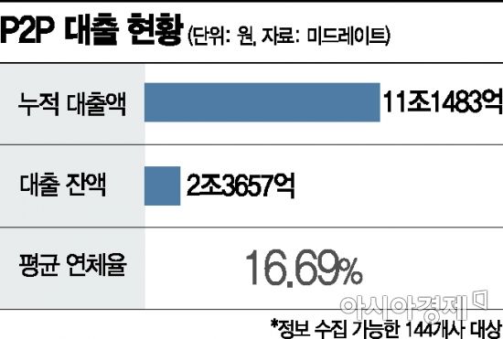 국내에서 P2P사들이 영업을 시작한 지 5년 가까이 되면서 연체율 관리에도 비상이 걸렸다. P2P 통계업체 미드레이트에 따르면 전날 기준 144개사의 누적 대출액은 11조1483억원, 연체율은 평균 16.69%에 달한다.