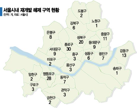 현재 서울에서 정비구역에서 해제된 곳은 총 176곳이다. 종로구가 30곳으로 가장 많고 영등포구 28곳, 성북구 20곳, 강동구 13곳, 중랑구 11곳, 서대문ㆍ동대문구 9곳, 은평구 8곳, 광진ㆍ동작구 7곳, 강북ㆍ성동구 6곳 등의 순이다.