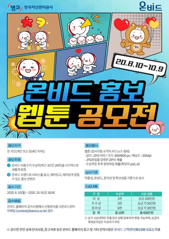 [아시아경제 박선미 기자] 캠코(한국자산관리공사)가 오는 10월 9일까지 2개월간 '온비드 홍보 웹툰 공모전'을 개최한다고 10일 밝혔다.