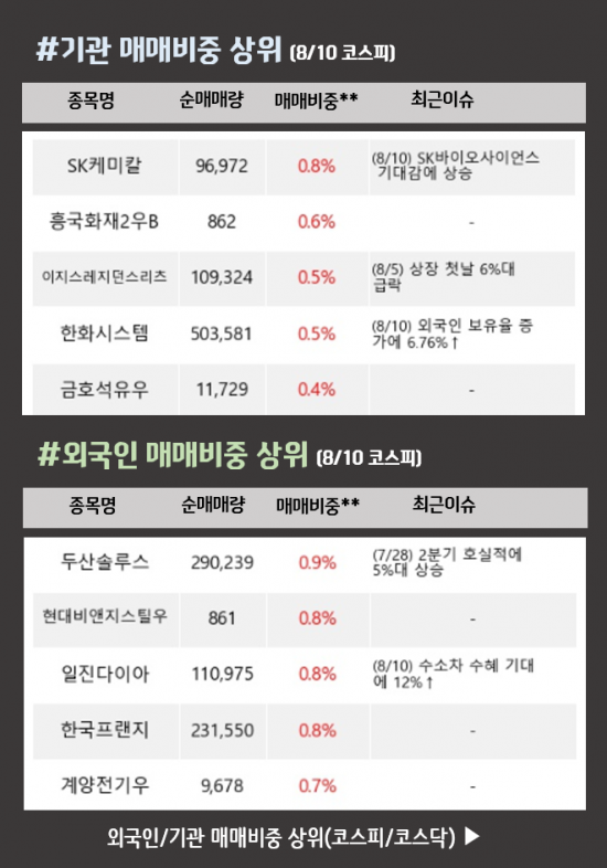 [오늘 외국인/기관 매매비중 상위 종목] (확인하기▶)