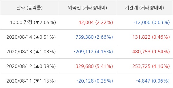 오늘 외국인은 두산인프라코어를 4만 2004주 순매수 하고 기관은 1만 2000주 순매도 하는 것으로 잠정 집계되고 있다. 최근 5일 동안 개인 투자자들은 105만 6551주 순매도 했고, 외국인과 기관은 각각 2만 6203주 순매도, 105만 9254주 순매수 했다.