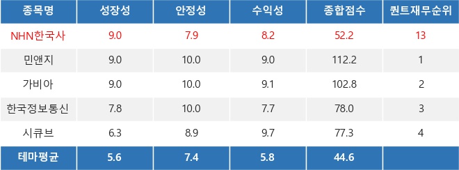 씽크풀 로보알고리즘 RASSI의 분석에 따르면, NHN한국사이버결제는 성장성, 안정성, 수익성 모두 테마의 평균 점수를 상회하면서 퀀트 재무 순위 13위(총 35종목)를 차지했다. 이는 재무적인 측면에서 테마 내 다른 종목들에 비해 NHN한국사이버결제의 투자 매력도가 높은 편이라고 해석될 수 있다.