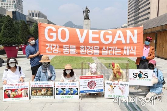 비건 세상을 위한 시민모임 관계자들이 19일 서울 종로구 광화문광장에서 세계 인도주의의 날을 맞아 기자회견을 열고 동물 착취 중단 및 비건 채식을 촉구하고 있다. /문호남 기자 munonam@