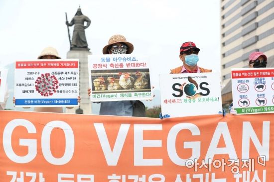 비건 세상을 위한 시민모임 관계자들이 19일 서울 종로구 광화문광장에서 세계 인도주의의 날을 맞아 기자회견을 열고 동물 착취 중단 및 비건 채식을 촉구하고 있다. /문호남 기자 munonam@
