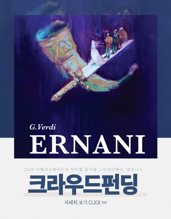 오페라 '에르나니'는 1994년 국내 초연 이후 27년 동안 공연되지 않은 작품이다. 이야기와 노래가 어려울 뿐 아니라 큰 작품이어서 제작비가 만만치 않기 때문이다. 이에 라벨라오페라단은 공연 제작 비용을 마련하기 위해 크라우드 펀딩을 진행한다.