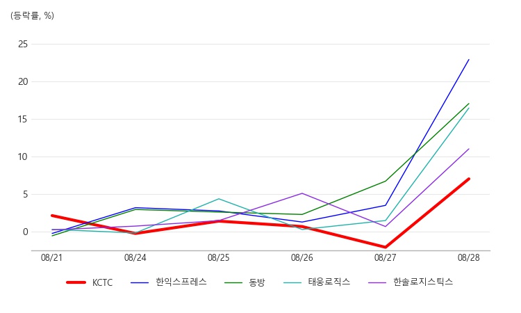 28일 종합 물류 테마가 전일 대비 5.46% 상승하면서 강세를 보이는 가운데 관련주로 주목받고 있는 KCTC이 전일 대비 3.18% 상승하며 급등하고 있다. KCTC은 항만하역, 운송 등을 영위하는 종합물류기업으로 알려져 있다.