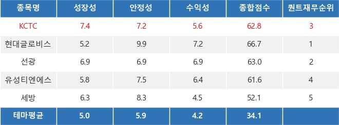 씽크풀 로보알고리즘 RASSI의 분석에 따르면, KCTC은 성장성, 안정성, 수익성 모두 테마의 평균 점수를 상회하면서 퀀트 재무 순위 3위(총 16종목)를 차지했다. 이는 재무적인 측면에서 테마 내 다른 종목들에 비해 KCTC의 투자 매력도가 높은 편이라고 해석될 수 있다.