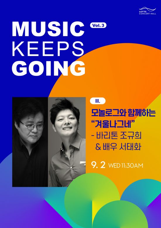 [아시아경제 박병희 기자] 롯데문화재단이 오는 9월2일 오전 11시30분 무관중 온라인 공연 지원 사업 '뮤직 킵스 고잉(Music Keeps Going'을 바리톤 조규희와 배우 서태화의 무대로 꾸민다.