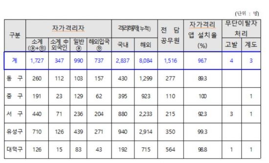 [아시아경제(대전) 정일웅 기자] 대전시가 자가격리 수칙 위반자에 대한 강력대응을 예고했다. 자가격리자가 급증하는 현 시점에 이들에 대한 관리가 신종 코로나바이러스감염증(코로나19) 확산 차단에 주된 성패 요인이 될 수 있다는 판단에서다.