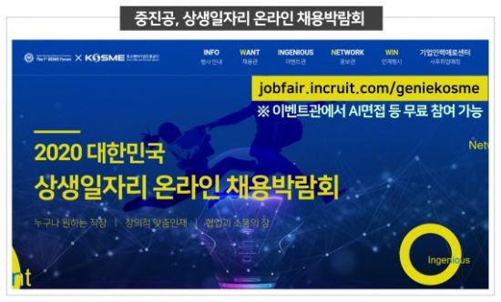 [아시아경제 김희윤 기자] 중소벤처기업진흥공단은 지니포럼조직위원회와 함께 2020 대한민국 상생일자리 온라인 채용박람회를 개최한다고 30일 밝혔다.