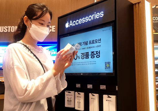 애플전용 판매대에서는 모니터를 통해 판매 중인 정품액세서리 상품 소개와 이벤트 영상이 송출되며, 에어팟 프로, 에어팟, 애플펜슬, 이어팟, 어댑터, 케이블 등 총 12종의 애플 정품 액세서리를 판매한다.