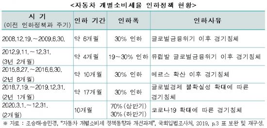 임동원 한경연 부연구위원은 "한시적인 개소세 인하가 끝나더라도 또다시 인하 할 수 있다는 사회인식이 형성되면 정상적인 소비행위가 일어나기 어렵다"고 말했다. 짧은 정책 주기를 고려해 소비자들이 다음 인하 시까지 자동차 구매를 연기할 수 있다는 의미다.