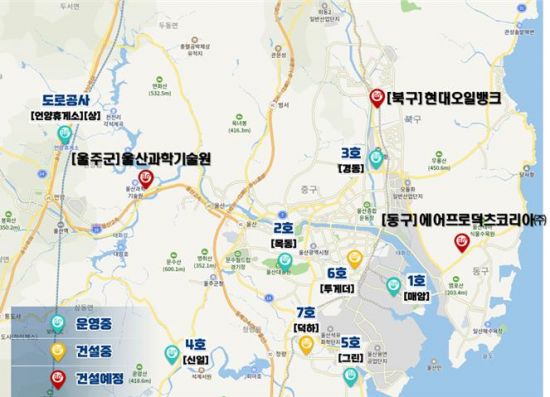 9월 말 투게더 충전소(여천오거리 인근), 덕하공영차고지 충전소(덕하공영차고지 내) 등 수소충전소 2개소가 추가 준공되고, 연말까지 3개소가 착공에 들어가는 등 내년에 총 11개소의 수소충전소가 운영될 예정이다.